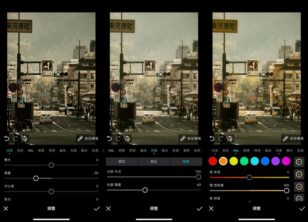 第二步我们只需要在AI仿色的基础上进行一些微调即可,例如我们这里降低一些亮度让画面更有质感,提高光感数值为画面加入一些发光效果,提高橙色饱和度进一步增强橙色的表现力: