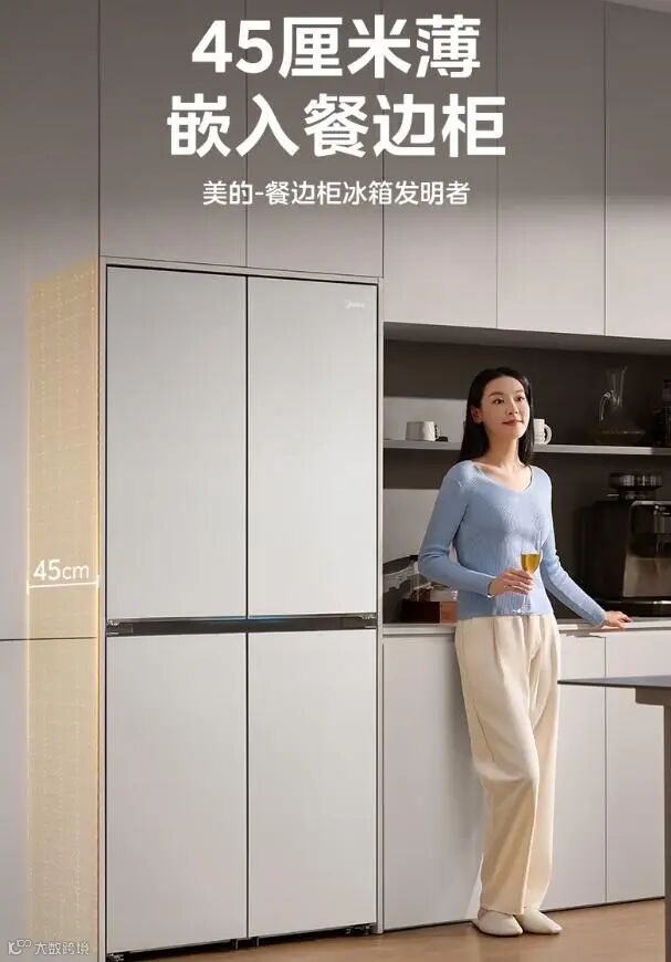这款45厘米超薄冰箱打破空间限制,轻松嵌入餐边柜或客厅隔断。427升容量足够三口之家使用,十字四开门结构合理分区,左侧饮品右侧食材,动线设计符合使用习惯。底部散热系统无需两侧预留空间,真正实现无缝安装。