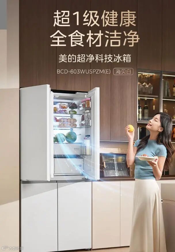 熊墩墩603升冰箱采用海贝白配色,钢化玻璃面板温润如玉,耐磨耐刮易于清洁。十字对开结构分区合理,八档宽幅变温适应多样存储需求。超净除菌系统实现九分钟急速净化,对内胆、搁架、食材表面病菌灭活率达99.999%。