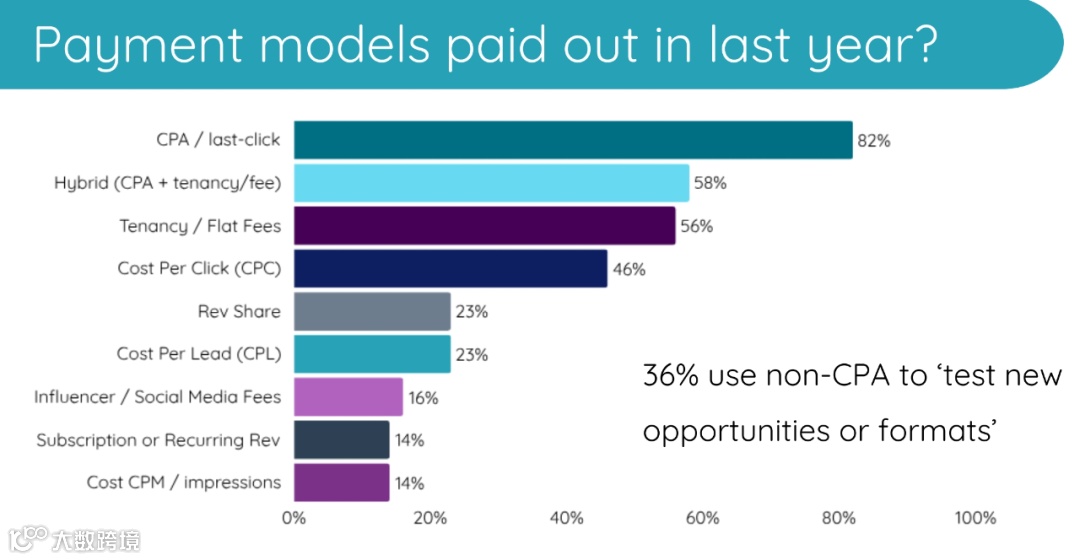 联盟营销的计费方式包括但不限于 CPS, CPC, CPL, flat fee 以及混合计费。在 APMA 联盟营销问卷调查 (商家&联盟客),我们也有提及。APMA 针对英国市场的问卷也有了结果,可以看到固定费用和 CPC均占有一定的比例。