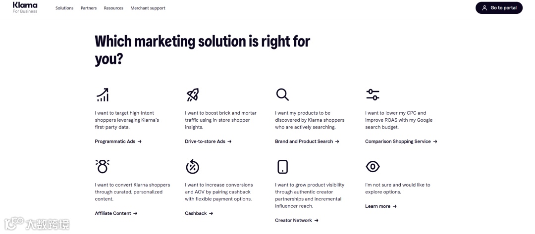 Klarna 的营销解决方案包括 ads, search, affiliate 三大类。其中,ads 计费方式为 CPM, search 计费方式为 CPC,affiliate 是 CPA +flat fee。