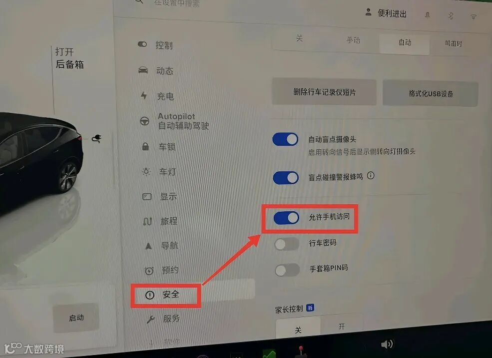 假如1-3都不能实现,那就来点狠的,车子我开走,但是打开车机系统,点击「安全」并找到「允许手机访问」,把这个关闭!如下图所示!