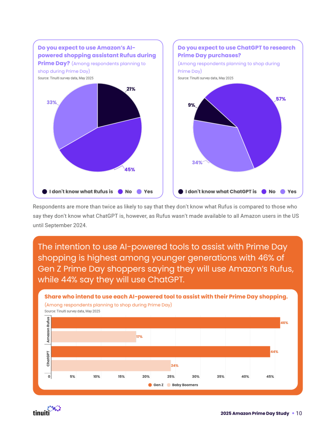 Tinuiti 的调查数据显示,34% Prime 会员受访者表示,他们希望使用 ChatGPT 来研究产品 Deal,而计划使用 Rufus 的受访者则为 33%。