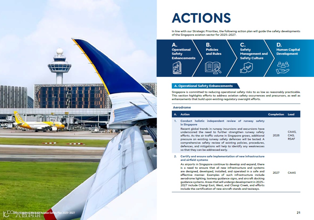 对于新加坡民航局(CAAS) 而言, 航空安全一直是,也将永远是首要任务。《新加坡国家航空安全计划》是一项联合行动计划,政府机构、航空企业和航空人员每三年共同合作一次,审视运营环境,识别新出现的安全风险,并采取协调一致的行动加以应对。首个《国家航空安全计划》于2022 年发布。其重点是在新冠疫情后平稳、安全地增加航空人力和运营。