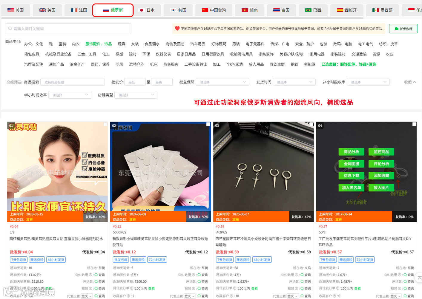 卖家可在店雷达热门国家货盘中看到俄罗斯跨境用户在1688平台下单的品,这些实时且具象的消费数据,能帮助卖家直观洞察俄罗斯当地消费者的真实需求与潮流风向,进而避开选品盲区、选择符合当地市场偏好的选品策略与备货方案。