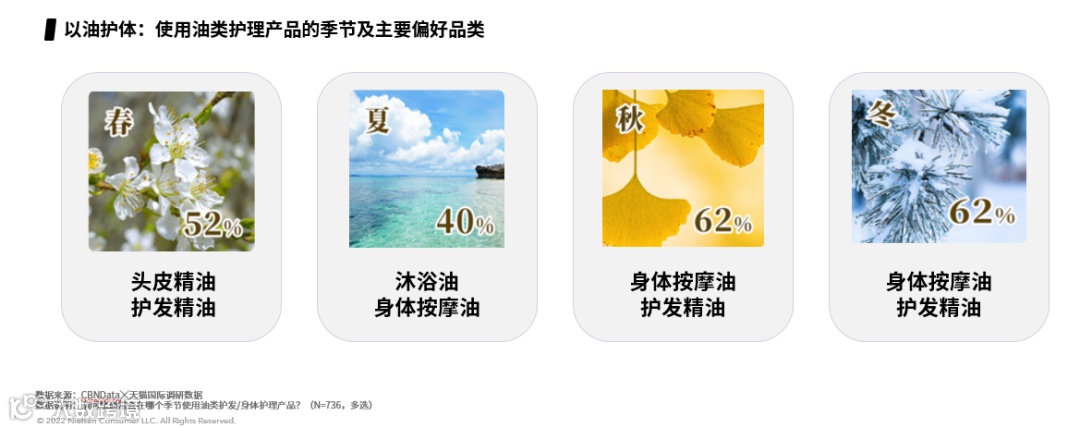 除了秋冬季外,消费者也愿意在春夏季使用油类护理产品,用于对头皮/头发的养护,身体肌肤滋养(沐浴油)以及身体按摩(按摩油),“以油护体”的概念贯穿四季;随着头部KOL、KOC在社交媒体上的传播教育,以及相关品牌的崛起,以油养肤的概念逐渐火热,相关衍生产品层出不穷。