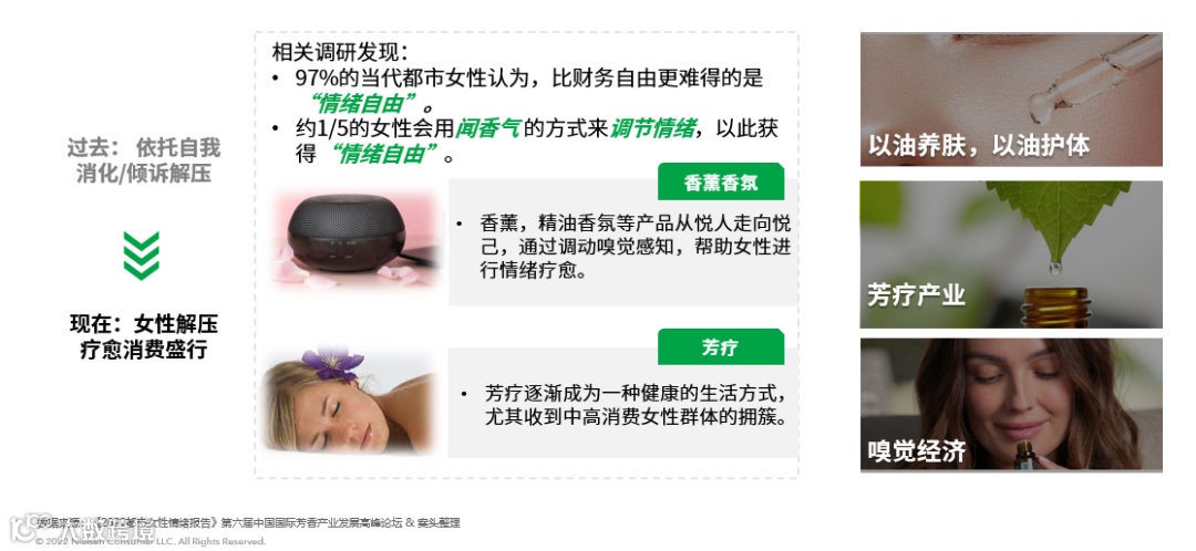 家庭、职场及社会压力催生女性自我疗愈型消费背景下,功效和情感价值共同驱动精油产品,主打滋润舒缓神经的油类护理产品方兴未艾,嗅觉经济应运而生