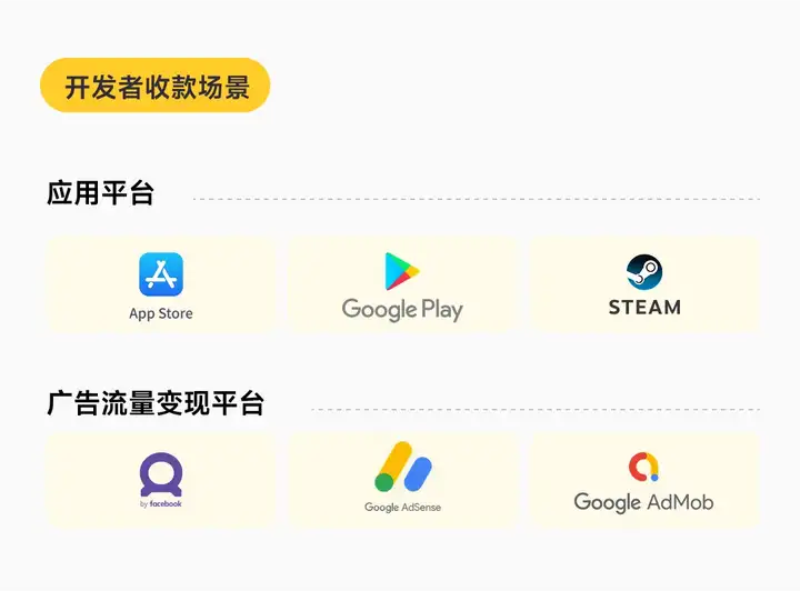 通过PhotonPay光子易开发者收款服务,游戏企业可以轻松收取来自App Store、Google Play、AdMob、Meta Audience Network、TikTok for Business、ironSource等多个平台的分账收入。