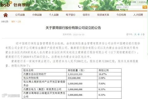 公告称,蒙商银行系一家城市商业银行,注册资本是200亿元,股份额是200亿股。股权结构是:存款保险基金持股27.5%,徽商银行持股15%,建信投资持股5%;内蒙古自治区财政厅持股16.67%,内蒙古电力公司持股8.33%,内蒙古高等级公路公司持股8.33%,包头稀土高新技术产业开发区管理委员会持股5%,内蒙古金融资产公司持股5%,内蒙古公路交通投资发展有限公司持股5%,包头市财政局持股2.08%,北方稀土公司持股2.08%。