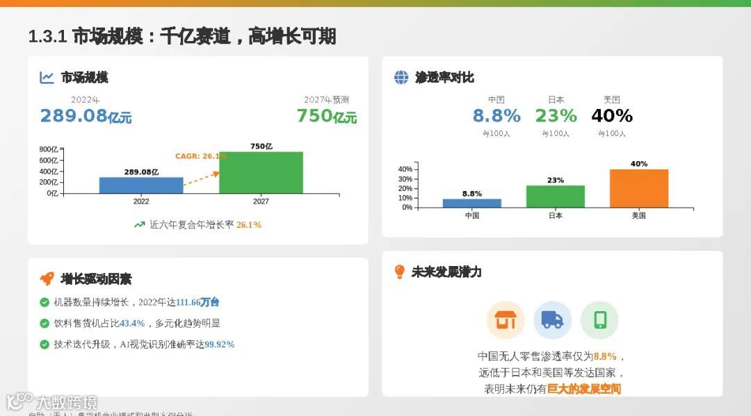 2022 年中国自动售货机市场规模达 289.08 亿元,机器数量 111.66 万台,近六年复合年增长率 26.1%,其中饮料售货机占比 43.4%;2024 年无人零售整体销售额突破 434.3 亿元,预计 2027 年将达 750 亿元,自动售货机在快消品零售中的占比将从 2024 年的 1% 提升至 8%(头豹 / 弗若斯特沙利文)。