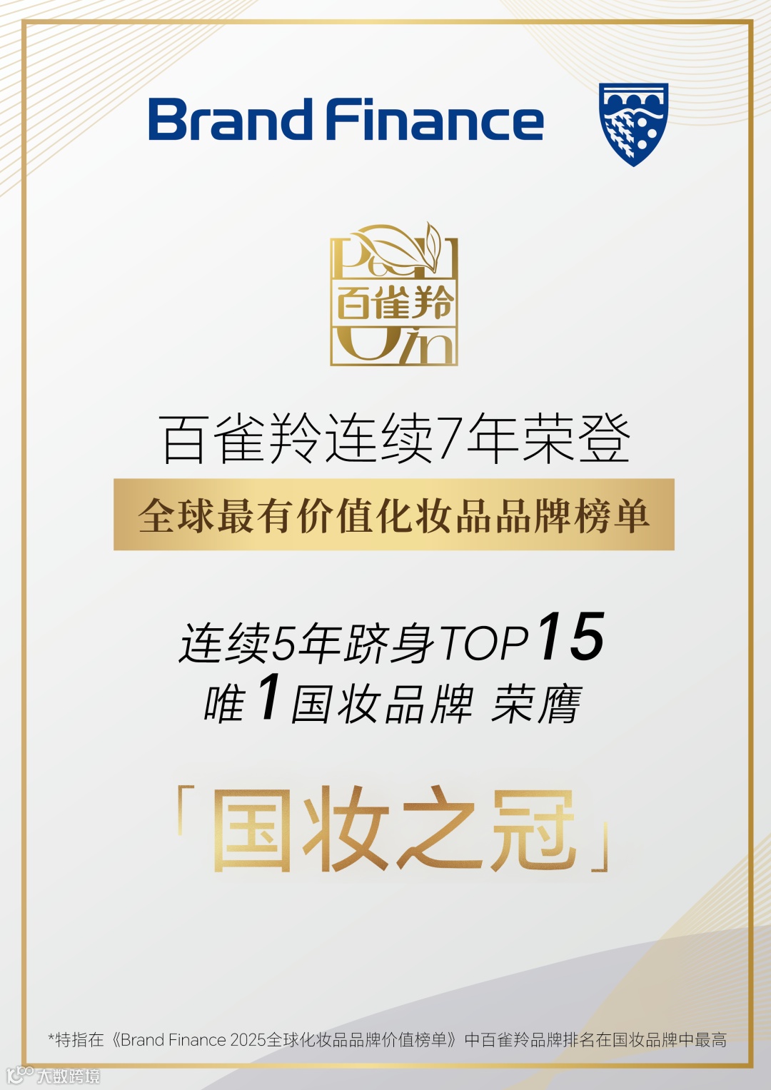 在夯实科研内功的同时,百雀羚的品牌价值也获得了国际权威机构的背书。在Brand Finance发布的《2025全球化妆品品牌价值榜单》中,百雀羚作为唯一的中国品牌跻身TOP15,连续7年稳坐“国妆之冠”宝座。这一排名不仅肯定了该品牌在中国市场取得的成功,更表明在全球美妆竞技场上,其具备了与国际巨头同台竞技的实力。