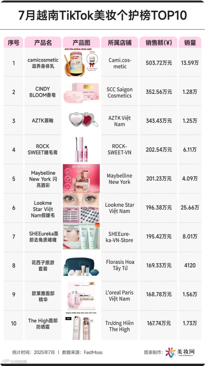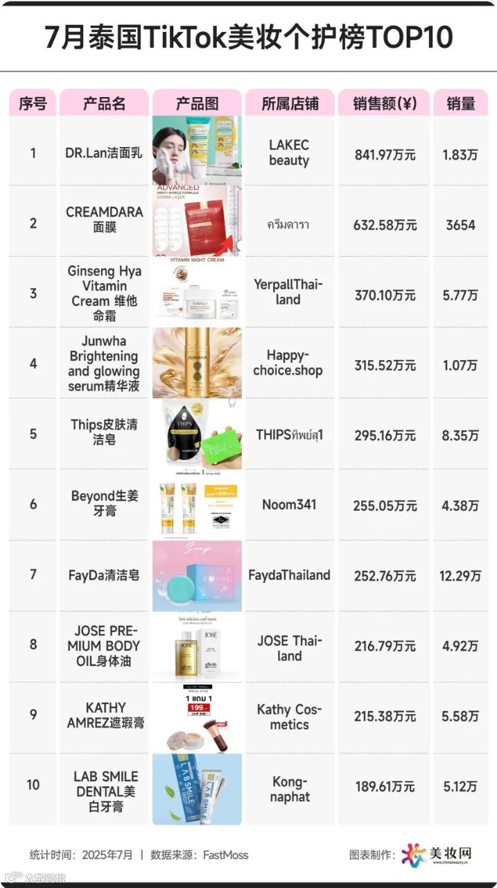 特别值得注意的是,泰国榜单中有三款清洁皂类产品(Thips皮肤清洁皂、FayDa清洁皂和Dr.Lan洁面乳),显示消费者对基础清洁产品的持续需求。同时,KATHY AMREZ遮瑕膏的上榜也反映了彩妆产品在泰国市场的潜力。