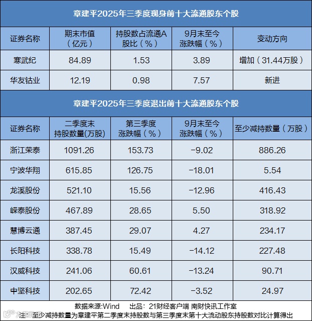 三季报数据显示,章建平在第三季度进行了堪称“大刀阔斧”的持仓调整。与二季度末同时持有9家公司的分散布局相比,其最新的三季度末持仓名单仅保留2只个股,分别是长期重仓的寒武纪(688256.SH)以及新进持有的华友钴业(603799.SH)。