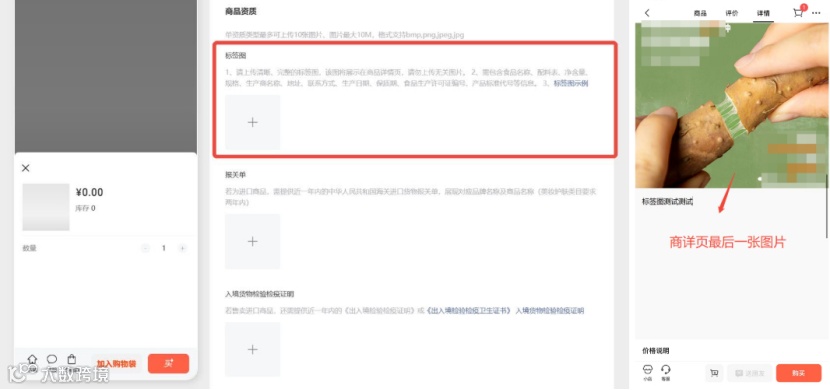 在标签图方面,商品标签标识内容必须清晰完整,严格按照各类目要求上传,发布至【商品资质-标签图】位置,上架成功后标签图会展示在前端商详页底图位置。