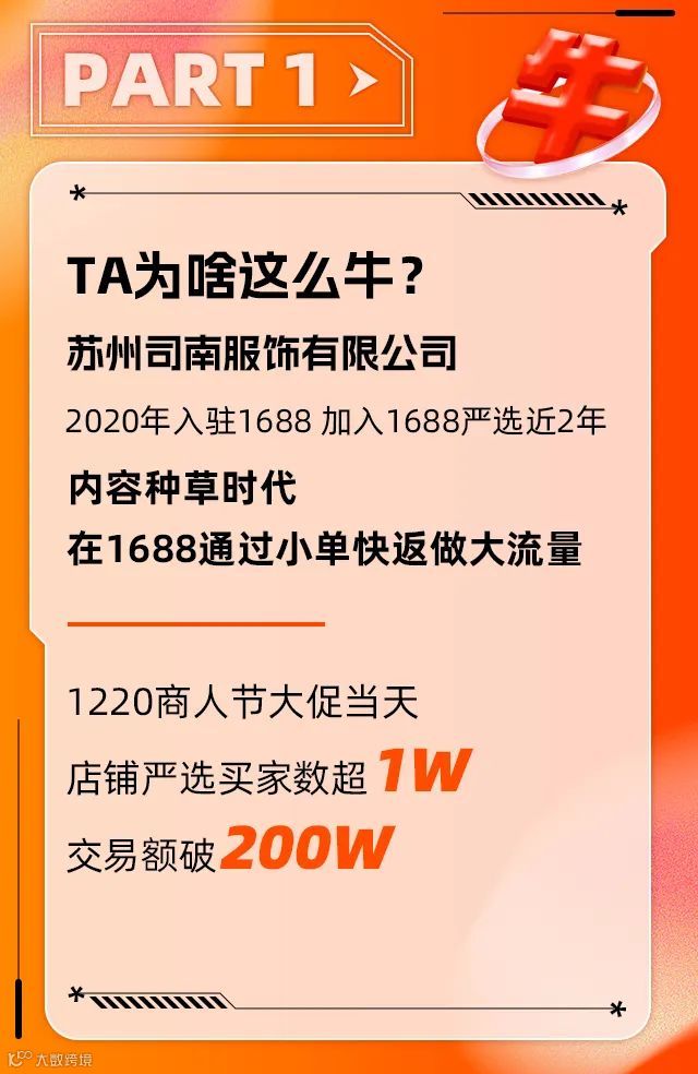 欢迎收看1688全行业访谈栏目《TA为啥这么牛?》第十六期,本期聚焦苏州司南服饰有限公司如何在1688严选实现千万级营业额的经营之道[k]