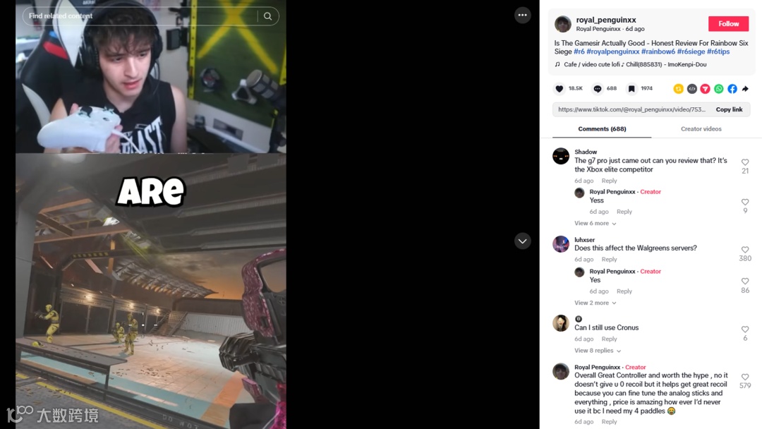 比如TikTok博主@royal_penguinxx, 他是一位专注于《彩虹六号:围攻》的知名玩家,他以使用手柄在PC上极端操作出名,特别擅长分享操作技巧和战略解析,在圈内拥有极高的影响力,与GameSir的产品调性十分契合。