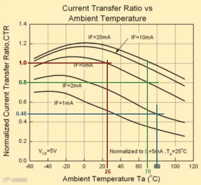 典型规律:25°C CTR = 100%,到 80°C 可能衰减至 50% 左右。