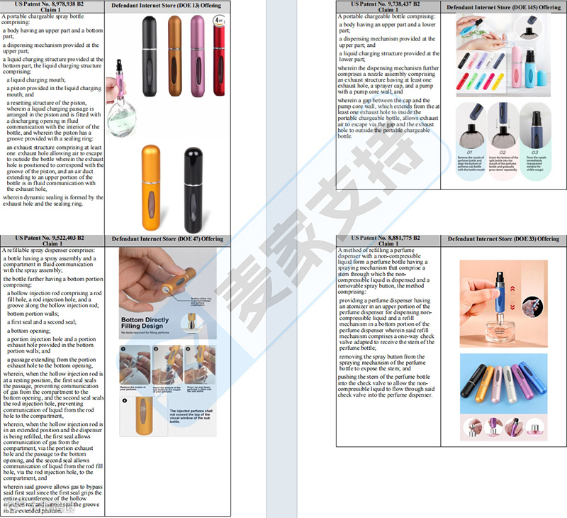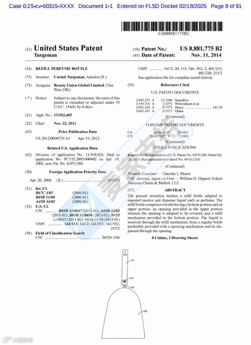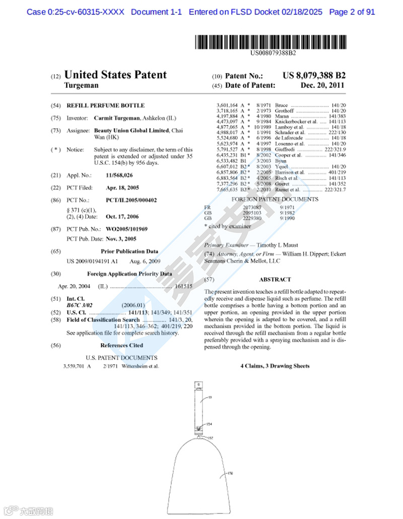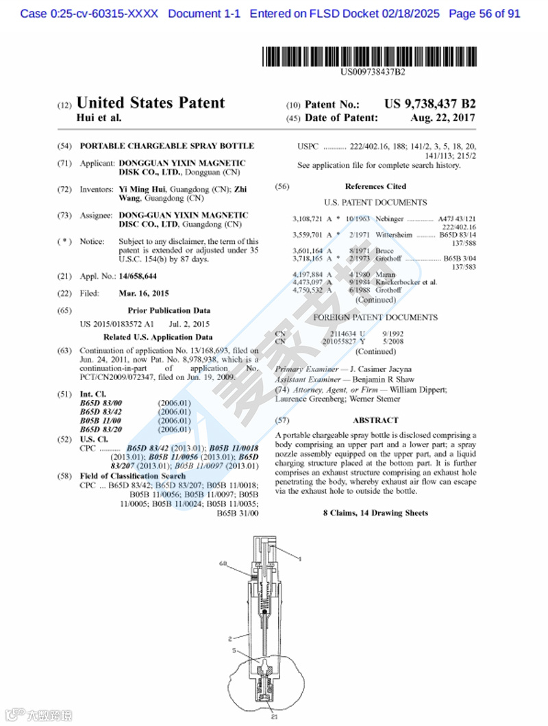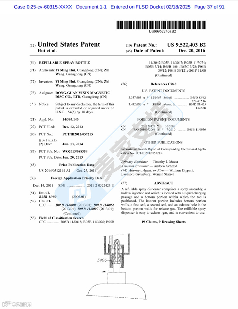 2月18日BSF律所代理香港企业Genie-S 在佛理里达州立案维权,本次案件共涉及8079388、8881775、9738437、8978938和95224035等5个美国发明专利,覆盖喷雾瓶结构设计、可循环填充系统、雾化控制技术等核心环节,专利文件厚度堪比教科书,高达90页之多!