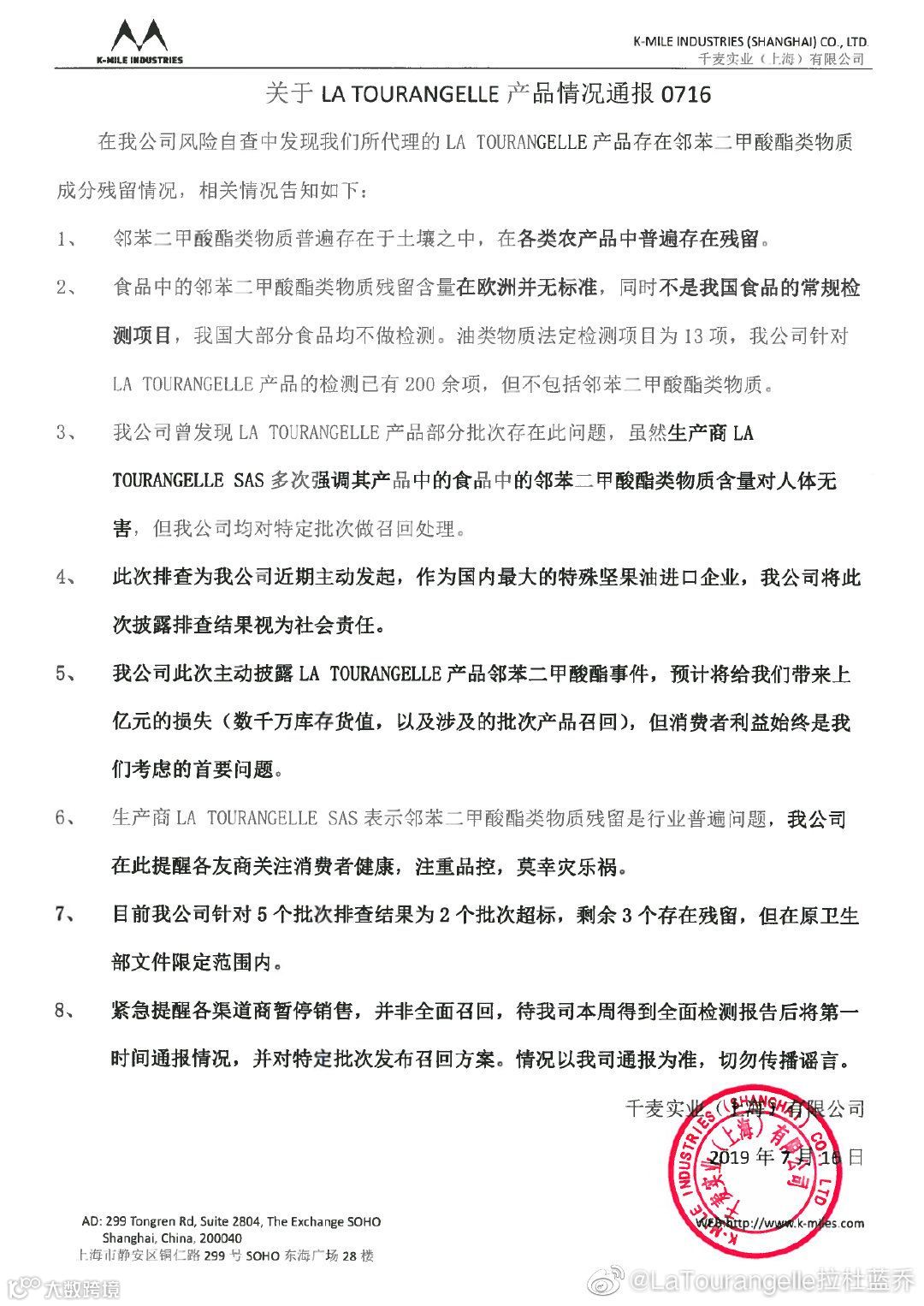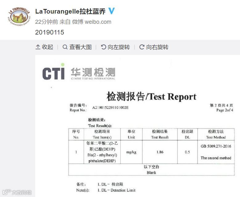 有一家据说辅食圈里的妈妈人手一瓶、价格大约是同类产品四倍的法国品牌 拉杜蓝乔(LA TOURANGELLE )核桃油,他们的经销商自爆产品送检发现塑化剂邻苯二甲酸酯类物质残留。