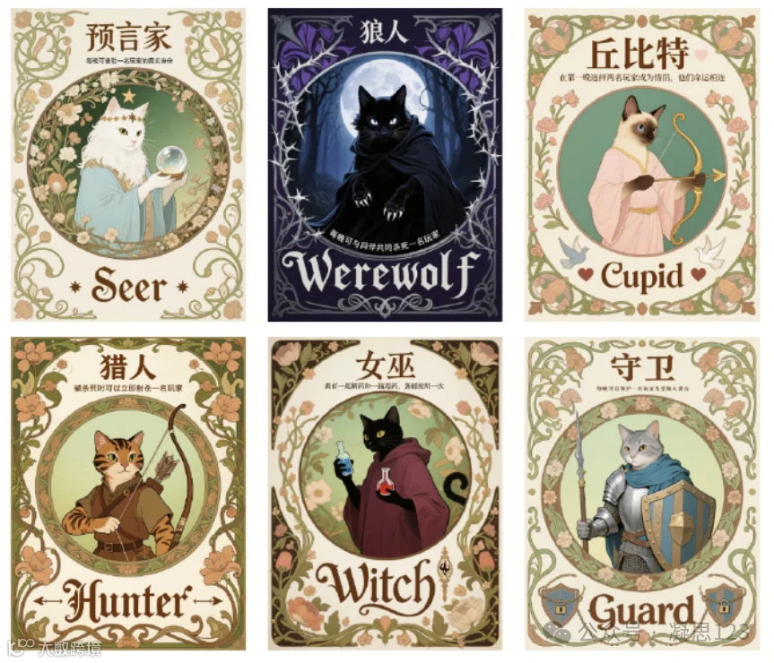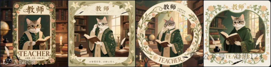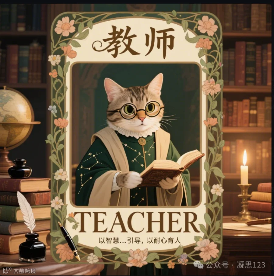 穆夏风格「教师」角色卡牌 AI绘画提示词:主题: 新艺术运动风格(阿尔丰斯·穆夏)的「教师」角色插画,优雅、知性,带有教育者的庄重与温暖。画面构图与风格整体风格:阿尔丰斯·穆夏(Alphonse Mucha)的装饰性新艺术风格,强调流畅的曲线、花卉藤蔓装饰、圆形构图和柔和的色彩。色调:暖色系为主,米白、浅棕、深绿、淡金,低饱和度,营造古典优雅的氛围。构图:中心对称,教师形象位于画面中央,背景环绕书籍、墨水瓶、羽毛笔等教育元素,搭配新艺术风格的藤蔓与花卉装饰边框。核心元素描述1. 主体角色(教师猫)形象:一只戴着圆框眼镜的猫,身穿19世纪欧洲学者长袍(深绿/米色),手持一本摊开的古籍,表情温和而睿智。姿态:站姿端庄,微微低头凝视书本,另一只手扶眼镜,体现思考与教导的神态。细节:长袍上有精细的刺绣花纹(书本、星座等知识符号)。眼镜镜片反光,呈现微妙的智慧感。2. 背景与装饰元素背景:古典图书馆的一角,隐约可见书架、地球仪、烛台,柔光透过彩窗洒落。装饰边框:环绕角色的是新艺术风格的藤蔓、百合花、月桂叶,线条流畅优雅。左右对称的装饰性曲线,类似穆夏的经典海报边框。文字元素:顶部:艺术字中文「教师」,字体柔美曲线,类似手写体,镶嵌在藤蔓花纹中。底部:装饰性英文“TEACHER”,字母融入花卉与墨水笔的装饰线条。侧边小字(可选):“以智慧引导,以耐心育人”,字体纤细古典。3. 色彩与光影主色调:深绿(学者袍)、米白(书本与背景)、淡金(装饰性高光)。避免高对比色,整体柔和雅致。光影:柔和的侧光,模拟烛光或黄昏光线,营造温暖氛围。角色面部和书本部分轻微提亮,突出焦点。