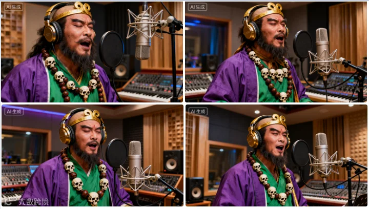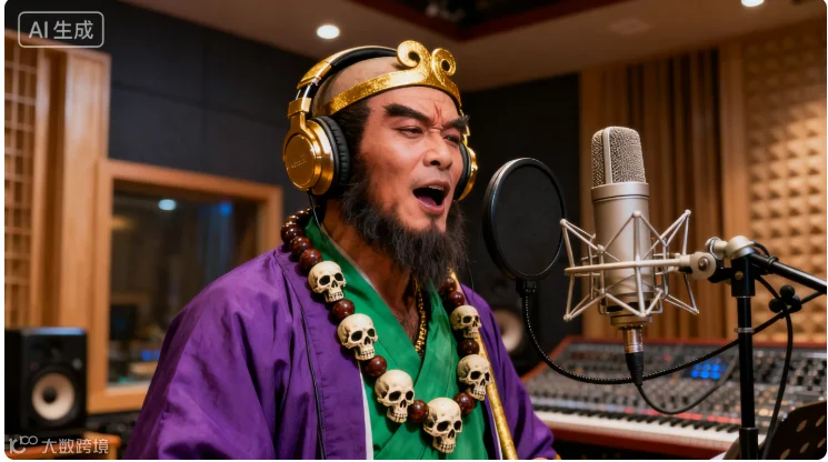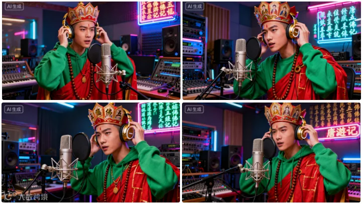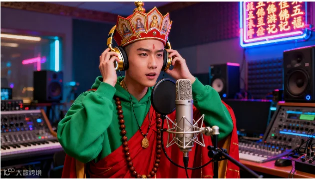 提示词: 唐僧在专业录音棚中录制音乐,头戴时尚金色无线耳机,项戴混合传统佛珠与微型骷髅头装饰的潮流项链。身穿一件解构风格的紫色缎面袈裟外套,内搭高饱和度绿色卫衣。双手扶着专业的纽曼U87麦克风,神情投入。背景是充满专业设备的录音室,隐约可见《西游记》经文以霓虹灯形式装饰在墙上。融合古典东方元素与现代嘻哈文化,赛博朋克光线,电影级光影,超高细节,8K分辨率。