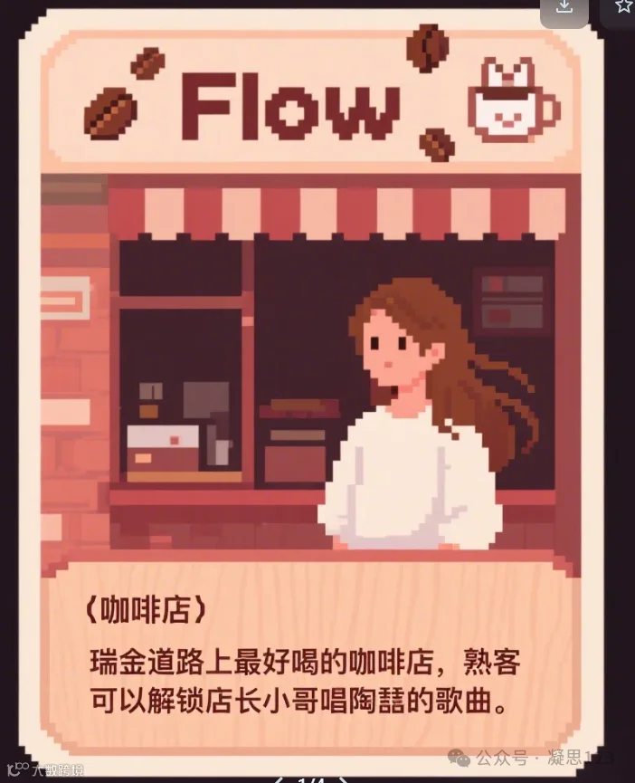中部为咖啡店像素形象,咖啡店窗口有一个棕色飘逸的长发,白色宽松衣服的店员。