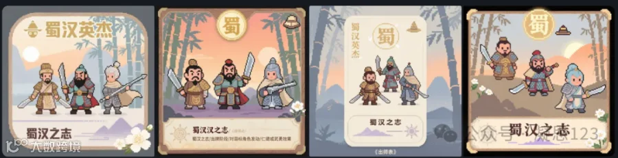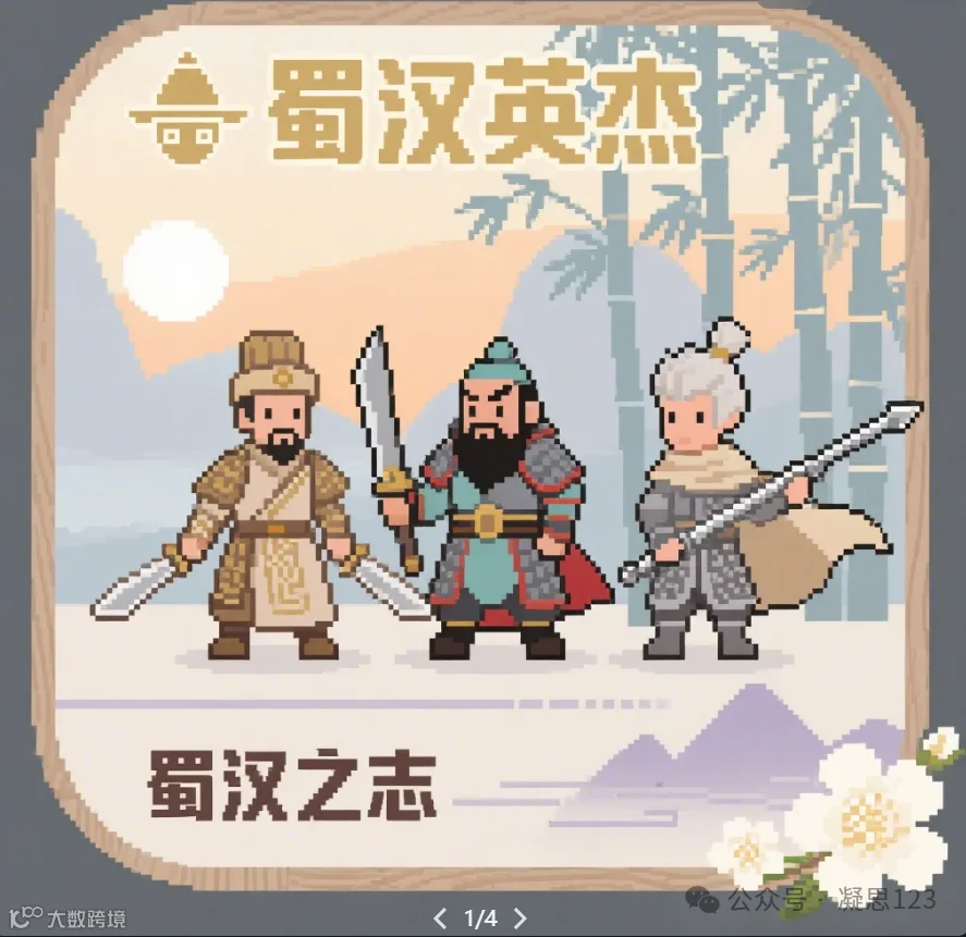 像素卡牌提示词:"低饱和度复古像素卡牌'蜀汉英杰',竖版圆角设计,整体色调为米褐/浅灰蓝/淡金组成的柔和色板。顶部标题区:淡金色圆润像素字体书写'蜀',轻微发光效果右上角配简约像素版诸葛帽图标,线条圆润中部主体:Q版蜀国武将(刘备/关羽/赵云三选一),星露谷式大头身比例刘备版本:穿着浅褐布甲配淡金纹样,手持双股剑关羽版本:淡青灰铠甲配暗红装饰,举像素偃月刀赵云版本:浅灰蓝鳞甲配米色披风,持亮银枪背景为低饱和度成都竹林剪影,搭配浅橙晨曦光晕底部说明区:圆角像素文本框,深棕像素字体:"蜀汉之志/出牌阶段/对目标角色发动/仁德或武勇效果"配以浅灰紫的蜀地山脉简笔画分隔线边框装饰:浅木纹圆角边框,镶嵌低饱和度元素:小朵白色山茶花(蜀地象征)像素化的三星堆太阳纹样若隐若现的《出师表》像素文字底纹整体要求:严格限制色彩饱和度(所有色相明度小于百分之三十)像素单位大小统一(建议8位风格)所有线条必须圆润无尖锐角光影效果仅允许柔光弥散风格参考:星露谷人物设计+《风来之国》场景色调+《八方旅人》卡牌用户界面"