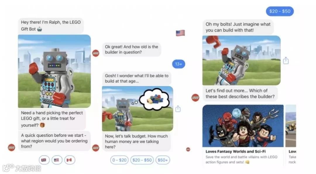 除了问候语也可以设置关键词回复。关键词回复要根据不同的销售场景来设计,下面就是一个乐高商家在messenger上的私信回复。