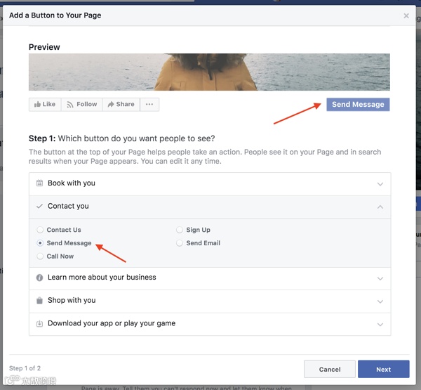 在facebook中,还可以在主页设置一个放置在主页背景照片上的CTA按钮,并且可以根据需要选择按钮的功能和文字。