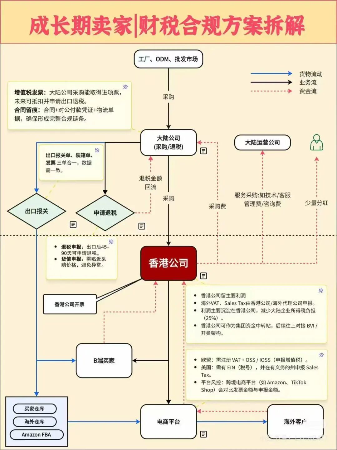 企业应重新审视自身的业务流程 ,确保合同、发票、物流、资金流"四流合一 " 。对于采用"国内公司+香港公司"架构的卖家 ,需特别注意关联交易定价的合理性 ,避免被认定为"转让定价避税"。