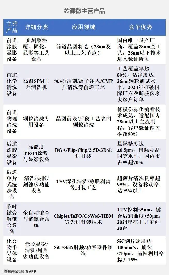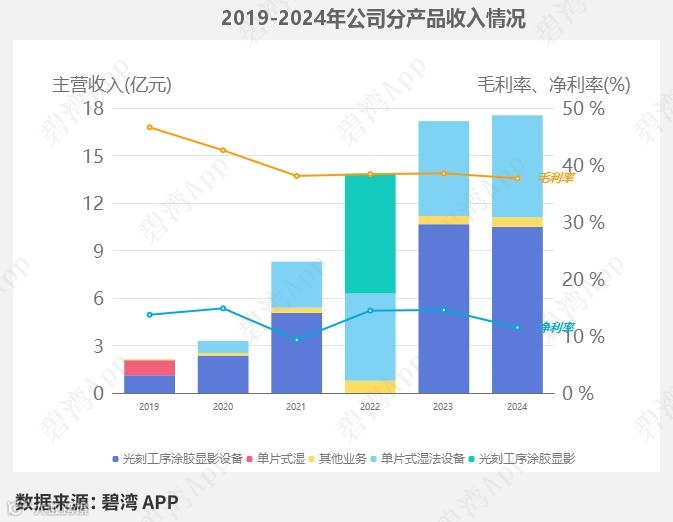 2024年公司的主营业务为半导体设备行业,主要产品包括光刻工序涂胶显影设备和单片式湿法设备两项,其中光刻工序涂胶显影设备占比59.86%,单片式湿法设备占比36.76%。