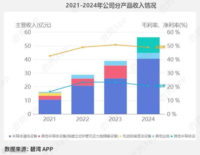 2024年公司的主营业务为半导体设备,主要产品包括半导体清洗设备和其他半导体设备(电镀、立式炉管、无应力抛铜等设备)两项,其中半导体清洗设备占比72.22%,其他半导体设备(电镀、立式炉管、无应力抛铜等设备)占比20.24%。