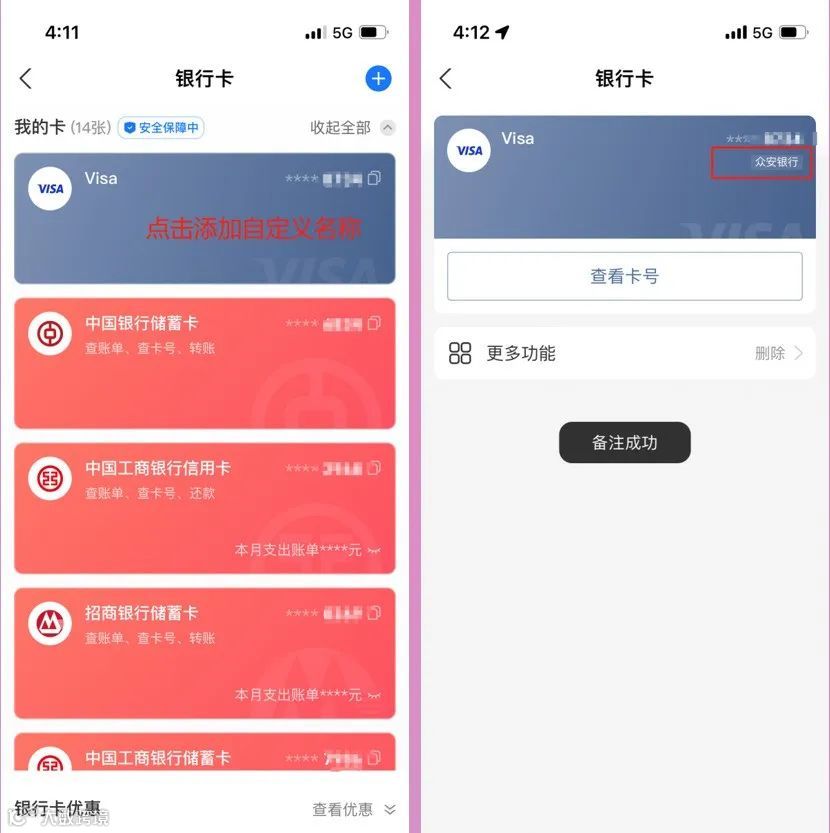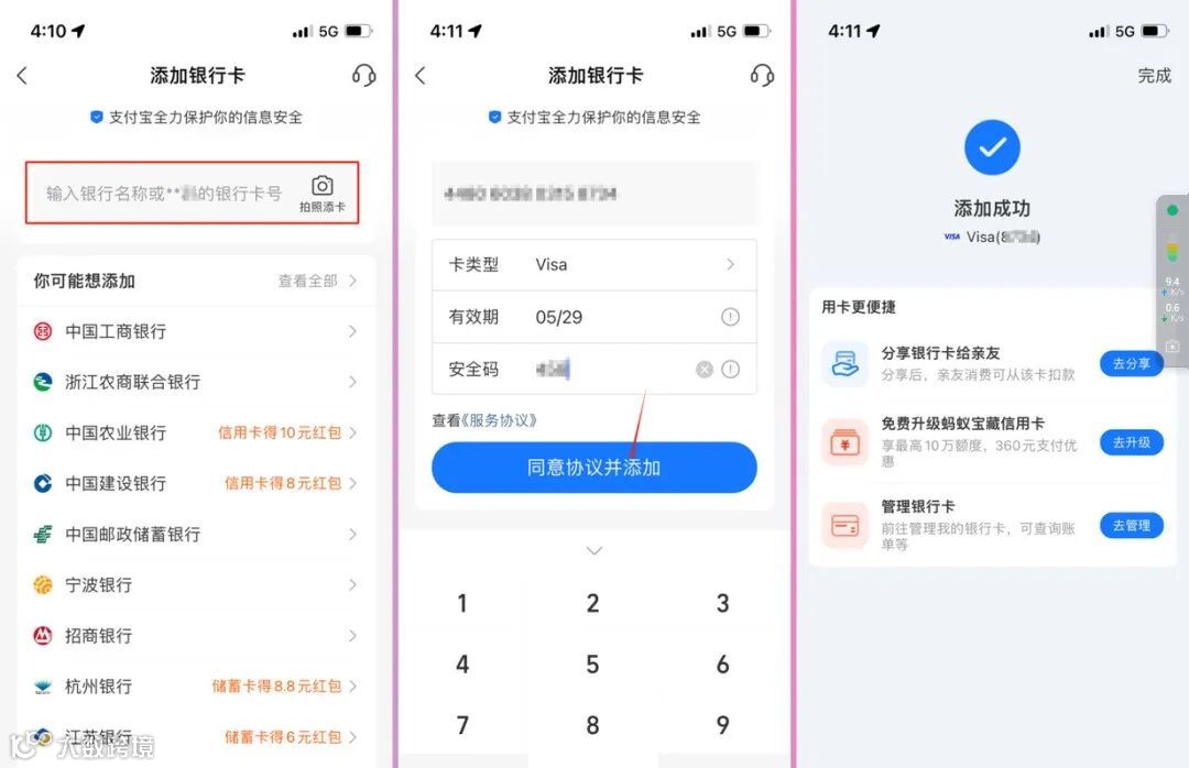 绑定流程和微信差不多,在支付宝里直接输入卡号,识别出VISA卡后,填写有效期和CVV,添加成功后还能自定义卡名方便辨认。