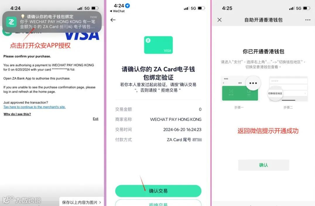 具体操作是,打开微信小程序“Wechat Pay HK”,点击“自助开通香港钱包”,按绑定香港发行信用卡的流程,输入卡号、有效期、安全码这些信息,设置支付密码,跳转众安APP确认授权,就能开通成功。