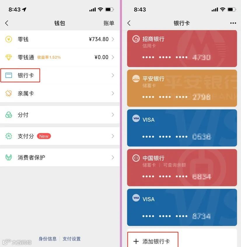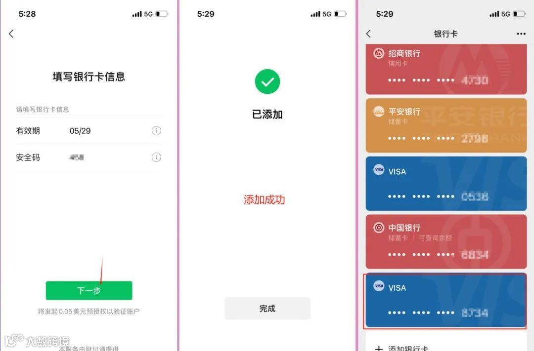 切换到大陆微信钱包,点击“银行卡 - 添加银行卡”,输入ZA Card卡号,跳转众安APP授权,完成添加。