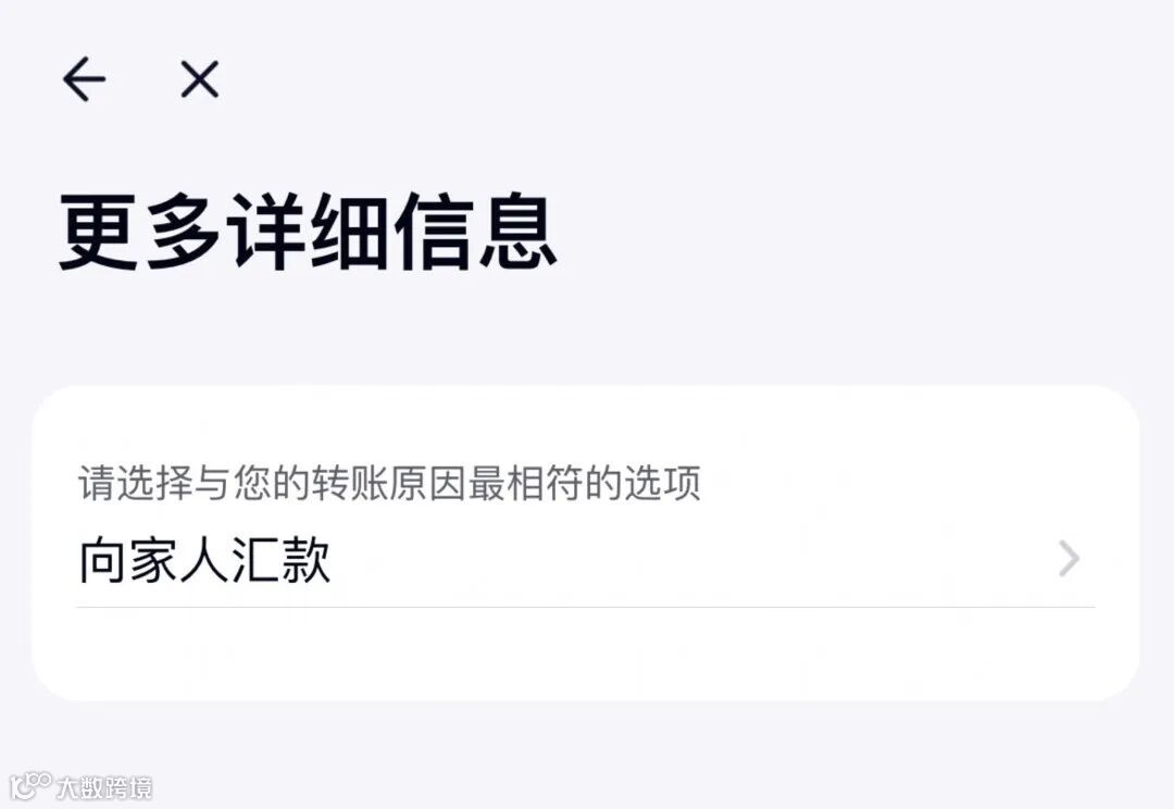 填完收款人信息,还有汇款用途可选,一般选“向家人汇款”就行。