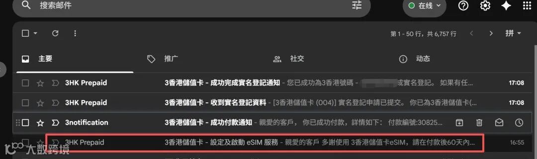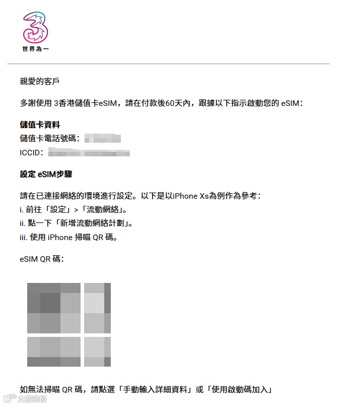 付款完成后,3HK 会将 eSIM 二维码发送至你的注册邮箱。