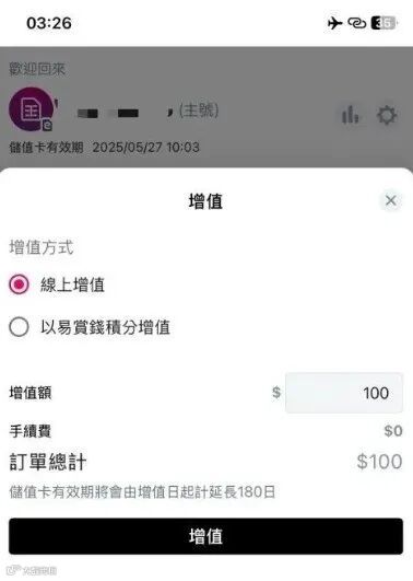 接下来选择充值金额,如果你短期内暂时用不到这张卡进行流量上网,那就可以先充值100港币 即可续期180天。