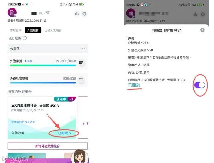 点击页面左下角返回主页,选择 “外游服务”,找到已购买的套餐,确认流量服务已正常开启。