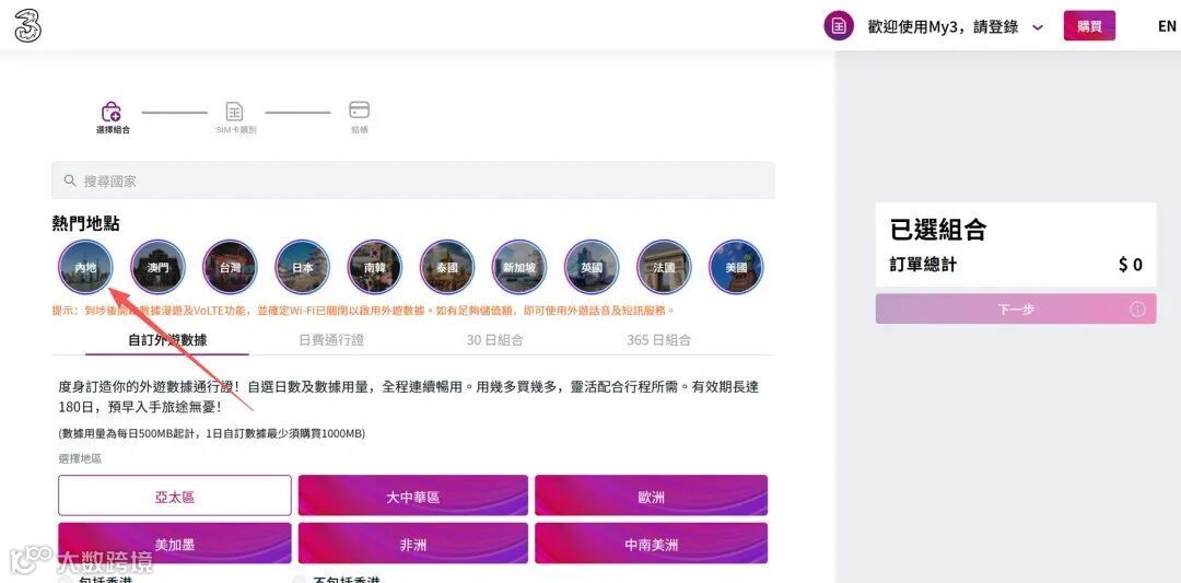 页面提供多种热门套餐选项,可根据自身需求挑选。若你是大陆用户,直接选择 “内地” 相关套餐即可。