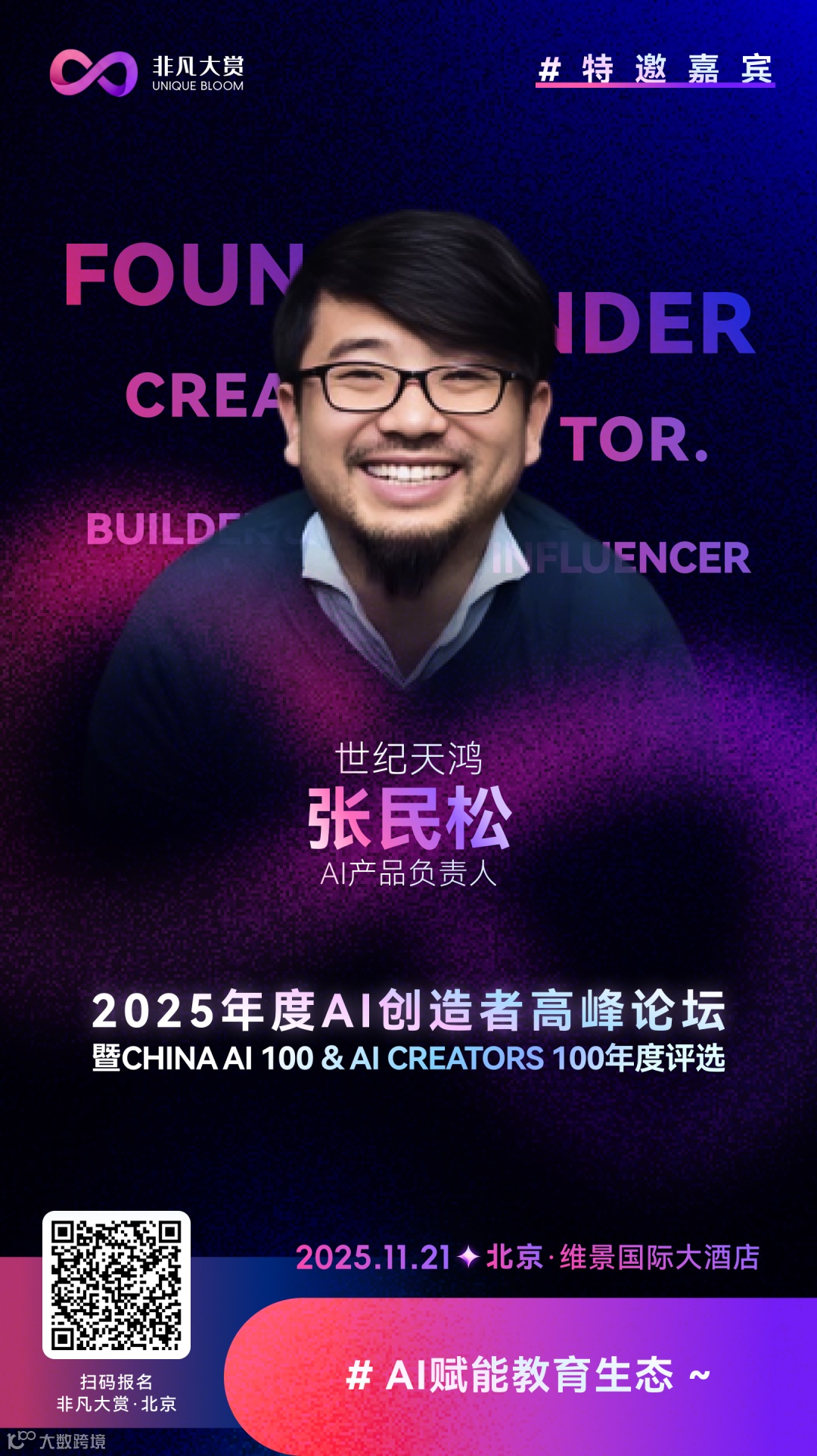 张民松:我早年在盛大、暴风影音、猎豹移动等公司做架构师和高级专家,也做过千万级 DAU 产品,后来连续创业深耕教育赛道,做过同步学、在线课程、在线口才相关赛道,做到过赛道老大,也跌倒过低谷。2021 年加入世纪天鸿,这是一家在 K12 教辅深耕 30 年的上市公司,核心品牌“志鸿优化”覆盖全国 30 多省市,图书累计发行超 10 亿册,现在正把“AI+教育”作为第二增长曲线来布局。