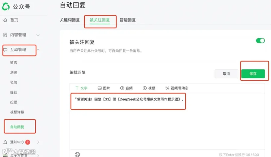 “感谢关注!回复【33】领《DeepSeek公众号爆款文章写作提示词》