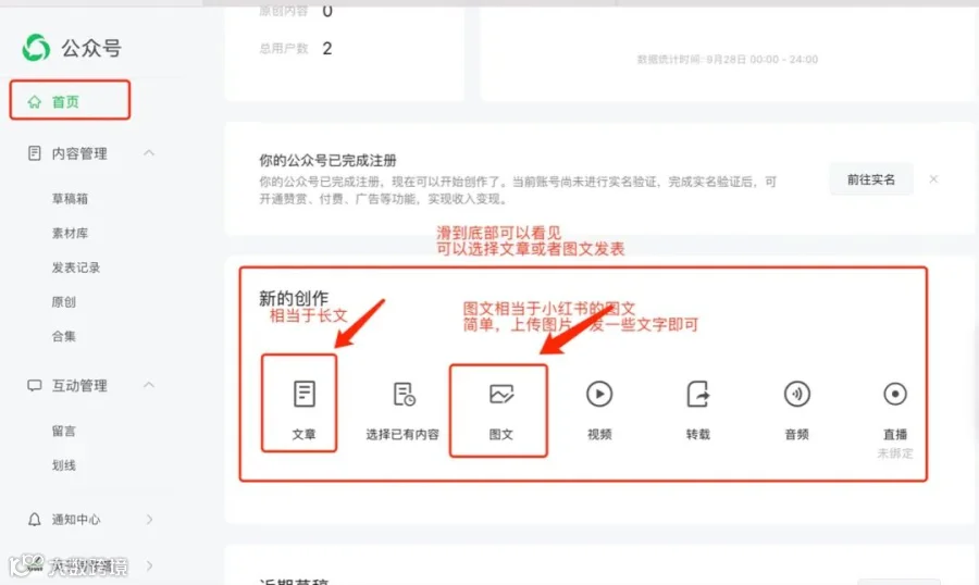 入口:电脑端后台→ 打开首页鼠标滑到底部→「图文素材」选择文章或者图文→ 点击文章进入;