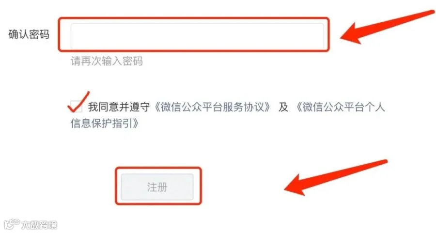 勾选「我已阅读并同意《微信公众平台服务协议》」,点击「注册」;