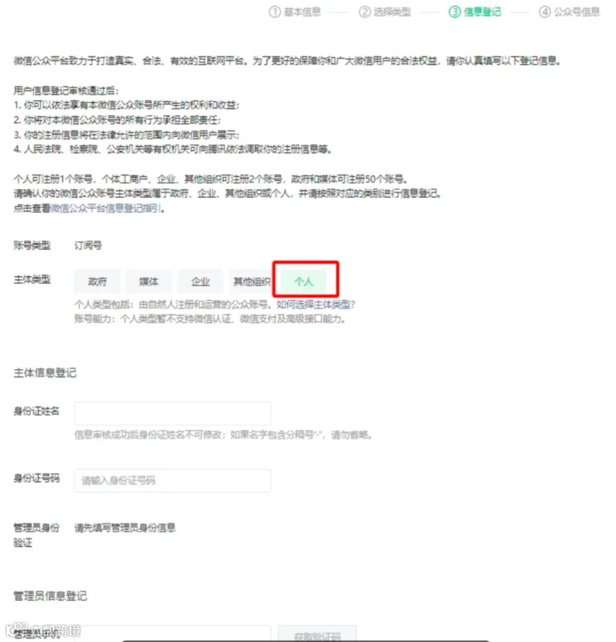 ✅操作:跳转后在“主体类型” 中选「个人」(重点:❌不是 “个体工商户”,后者需营业执照);填写“运营者姓名”“身份证号”(必须是本人真实信息,后续实名认证要用);拖动滑块完成验证,点击「继续」;