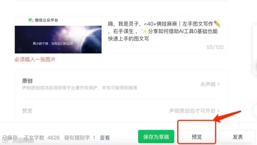 操作:点击编辑器右上角「预览」→ 用本人微信扫码→ 查看手机端效果(重点看排版是否乱、图片是否清晰)→ 有问题返回修改。
