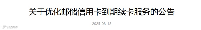 2025年8月18日邮储银行信用卡中心发布《关于优化邮储信用卡到期续卡服务的公告》,宣布将于2025年10月2日起,逐步优化信用卡到期续卡服务,即在信用卡即将到期前,按照卡产品属性,为客户提供选择续卡新卡形态的服务,具体优化调整如下: