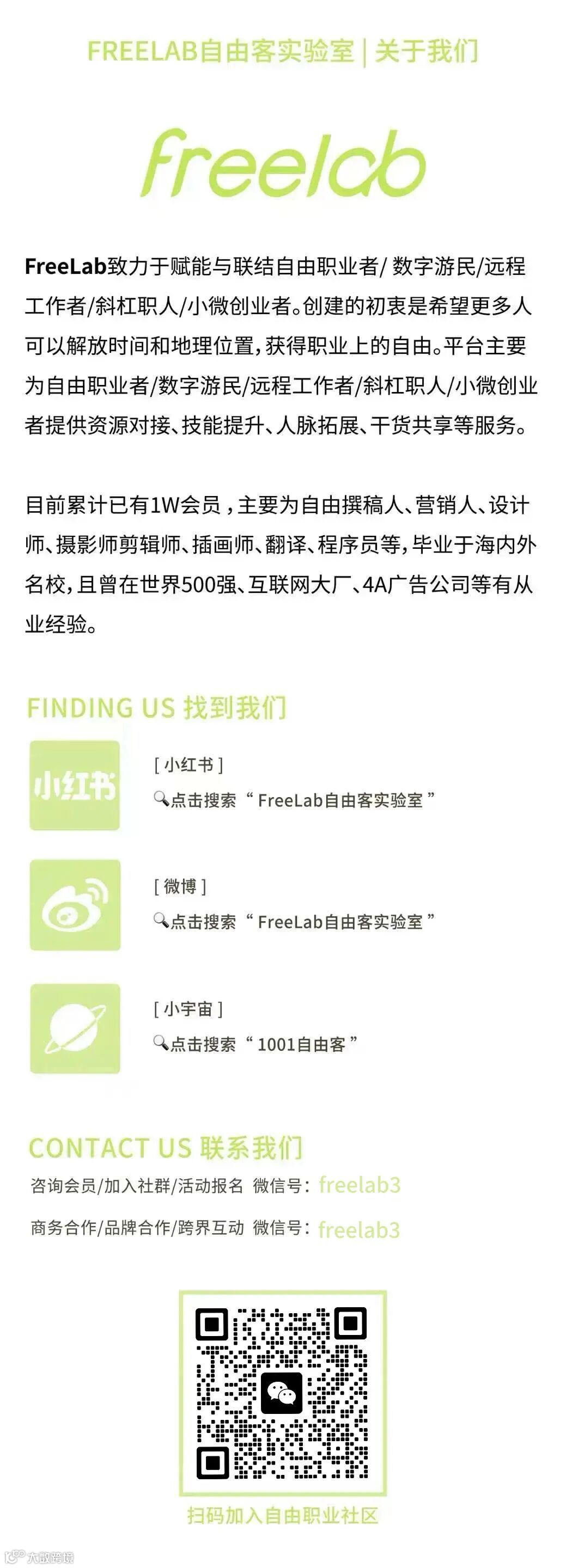 Freelab致力于赋能与联结自由职业者/ 远程工作者/斜杠职人/小微创业者。创建的初衷是希望更多人可以解放时间和地理位置,获得职业上的自由。平台主要为自由职业者/远程工作者/斜杠职人/小微创业者提供资源对接、技能提升、人脉拓展、干货共享等服务。