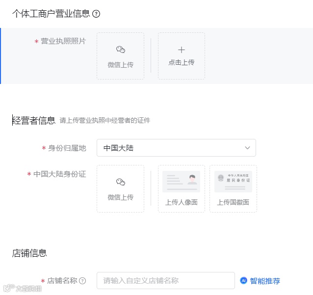 登录后选好你要开的店铺类型,然后按提示上传身份证营业执照照片,人脸验证一下,填写好店铺名称就完事了;