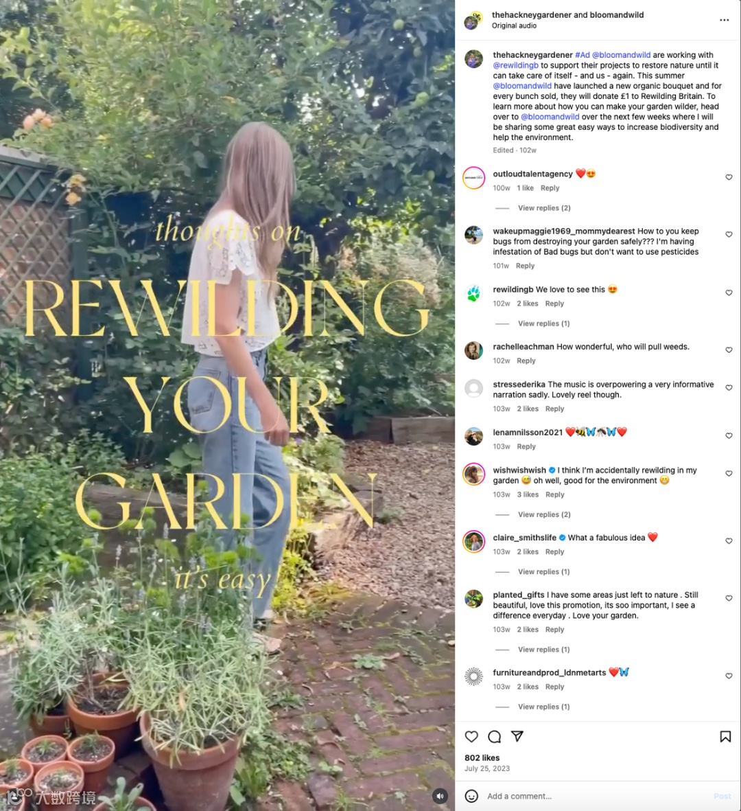 2023年,Bloom & Wild集中合作了37位家居与生活方式领域的腰尾部KOL,用于推广品牌的新产品——有机花束。然后品牌承诺每售出一组就会向自然保护组织“Rewilding Britain”捐助1英镑。